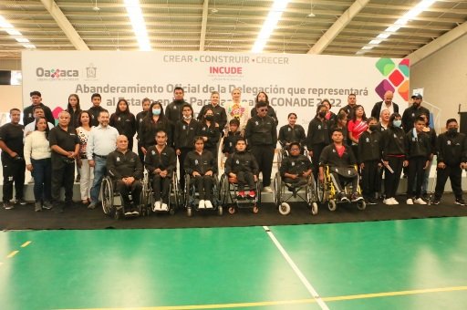 Oaxaca, Oax.- La delegación oaxaqueña integrada por paradeportistas, entrenadores, presidentes de asociación y delegados que competirán en los Paranacionales CONADE 2022, fue abanderada por la Presidenta Honoraria del Sistema DIF Oaxaca, Ivette Morán de Murat, quien encabezó la ceremonia realizada en el Complejo Deportivo “Hermanos Flores Magón”.