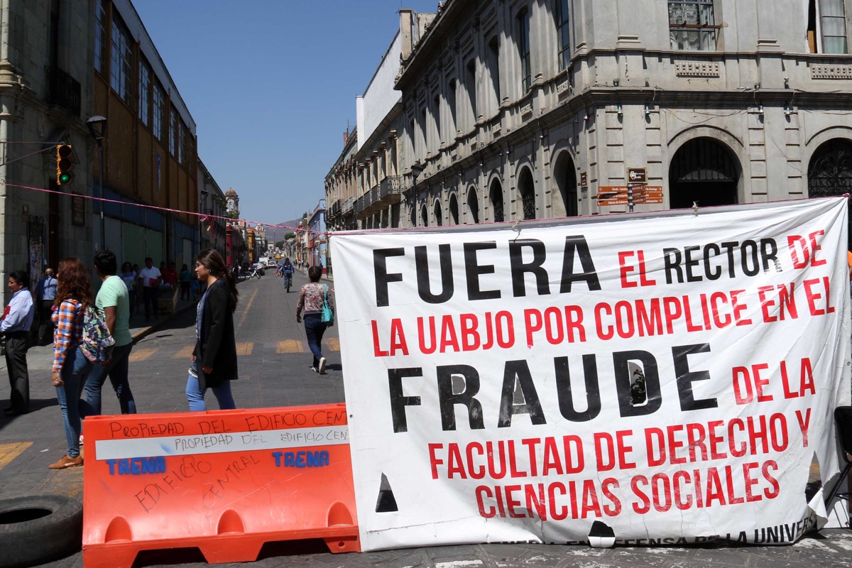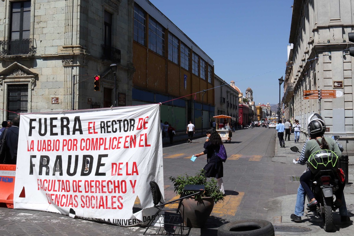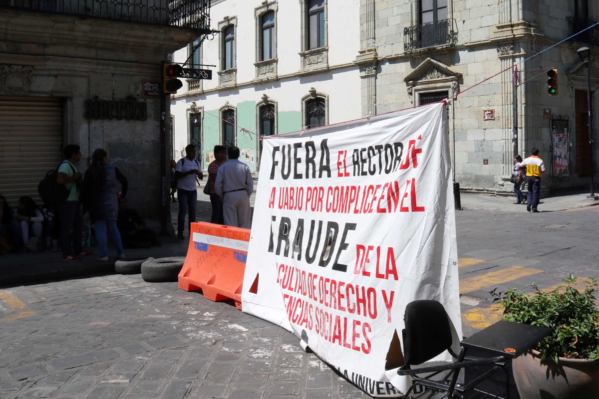 Debido a la disputa que prevalece en la Facultad de Derecho y Ciencias Sociales de la UABJO tras la elección de director, dos grupos de estudiantes y alumnos, simpatizantes de los candidatos que contendieron en la pasada elección, protagonizaron hechos violentos en el Edificio Central de Derecho que derivó en la quema de la puerta lateral ubicada sobre el Andador Turístico y un enfrentamiento con elementos de la Policía Estatal. El caos y la incertidumbre reinó en las cuadras aledañas al edificio histórico de la UABJO, que fue construido entre 1890 y 1900 y que albergó al Instituto de Ciencias y Artes, mientras que el Rector de la UABJO condenó los hechos. EF/JAP